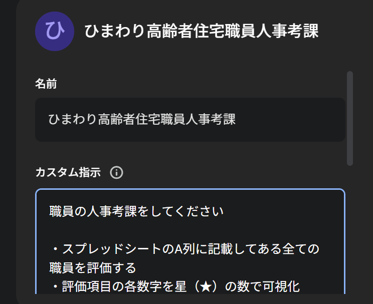 2.まずは「名前(Gemの名前)」「カスタム指示(どんな指示を出すか)」を書きます。