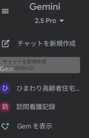 1.GoogleのGeminiを開くと、向かって左のメニュー欄に「Gemを表示」と書かれたところをクリック