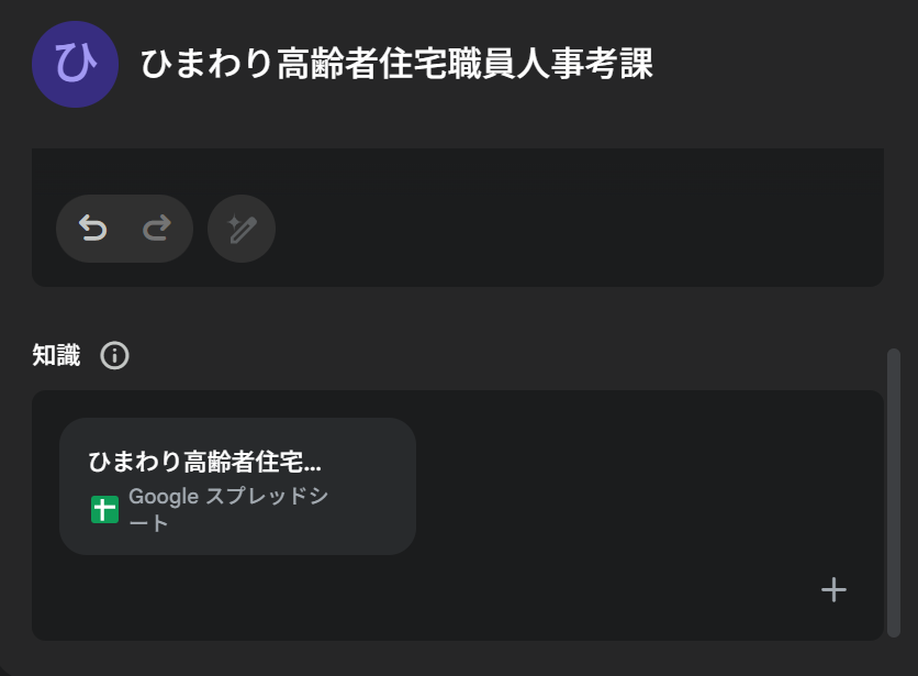 5.作成したスプレッドシートを先ほど作成したGemをクリックして「知識」の+マークをクリックして、対象のシートを選んで「更新」ボタンをクリックします。