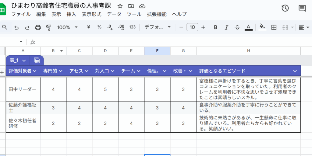 ※人事考課をする前にスプレッドシートにあらかじめ必要事項を書いておく必要があります。