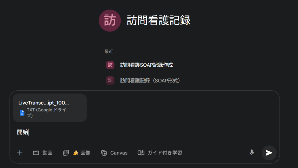 無料なので諸々の手間はかかりますが、Gemのカスタム指示にプロンプトを入れてあるので、必要なファイルを添付して「開始」と入力するだけです。